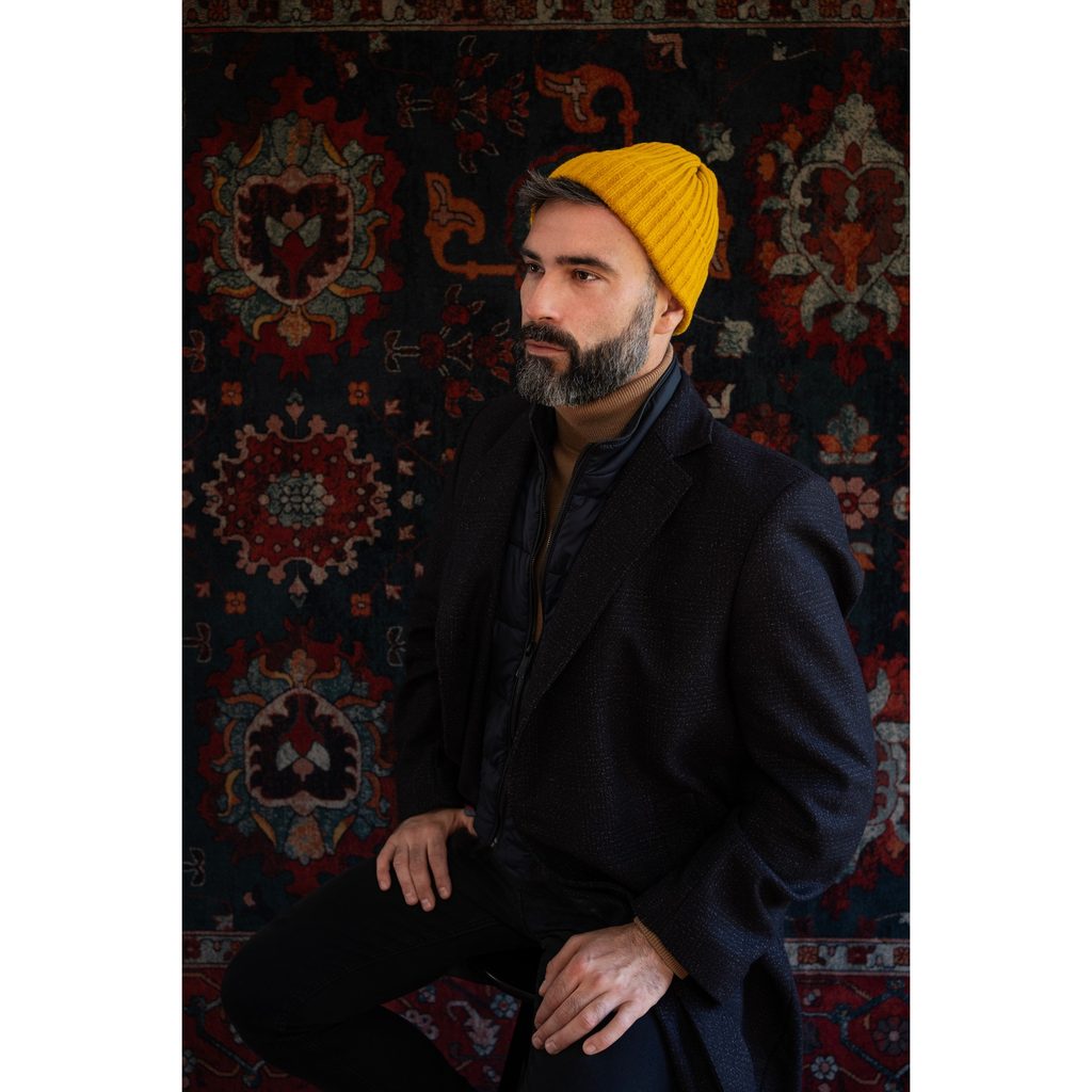Přechodná čepice z pleteniny. Provedená z nekousavého materiálu. Klasický střih. Spodní část na zahnutí. Dobře přiléhá k hlavě. Lehce elastická. Hodí se ke každodenním stylizacím.
