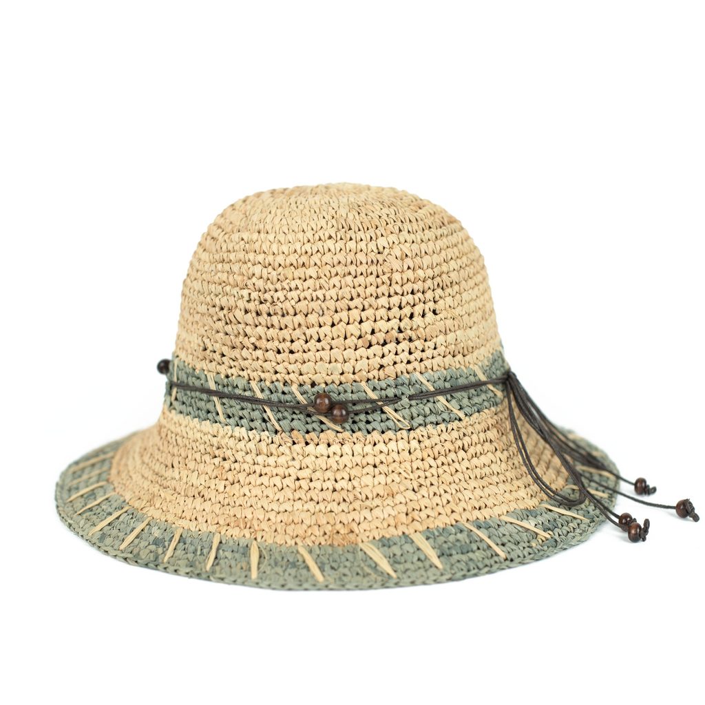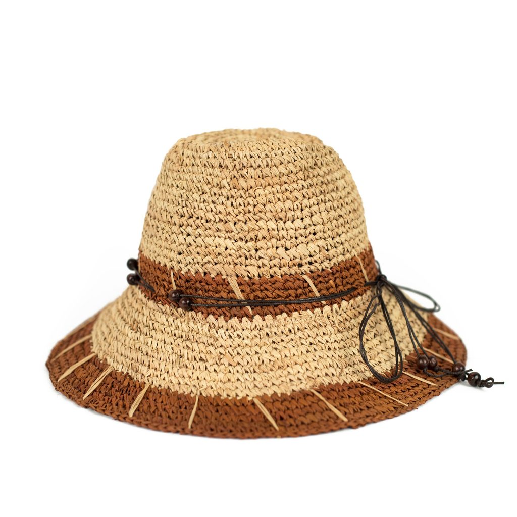 Letní klobouk se širokým lemem. Může být složen bez újmy pro tvar. Vzadu regulace obvodu. Lehký a vzdušný, ideální na vedra. Velmi lehký, hezky se prezentuje na hlavě. Hodí se zároveň v rozpáleném městě i na pláži.