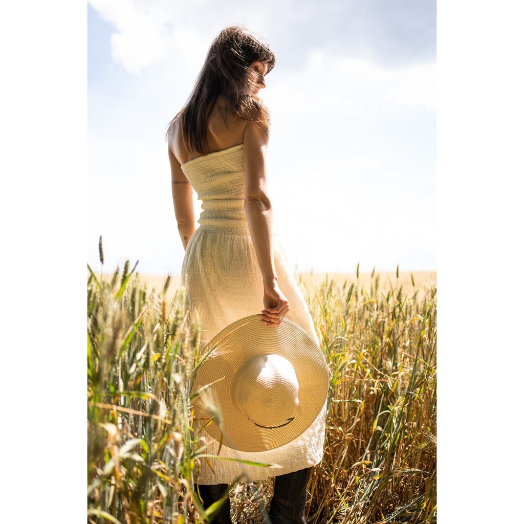 Letní klobouk se zdobeným lemem. Skvěle se hodí ke vzdušným letním šatům. Lehký a vzdušný, ideální na vedra. Stvořený pro milovnice boho a romantického stylu. Uvnitř se nacházejí pásky pro regulaci velikosti.