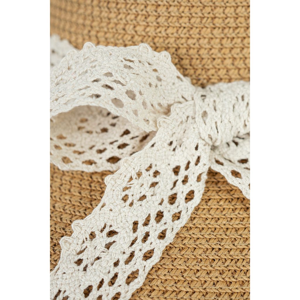Letní klobouk se zdobeným lemem. Velmi lehký, hezky se prezentuje na hlavě. Ideální pro milovnice romantických stylizací. Hodí se zároveň v rozpáleném městě i na pláži.