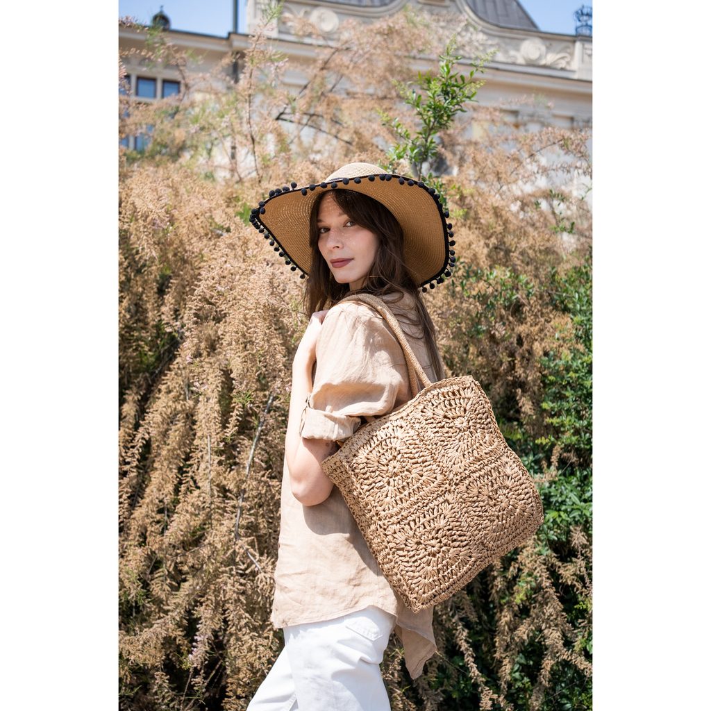 Letní klobouk se zdobeným lemem. Provedený z přírodního materiálu. Velmi slušivý. Hodí se zároveň v rozpáleném městě i na pláži.