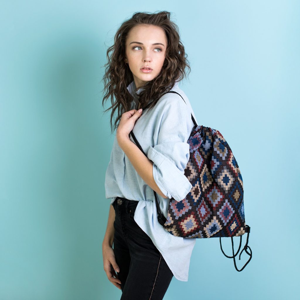 Barevný batoh typu vak. Batoh má stahovák. Praktický a lehký. Osvědčí se v každodenních městských stylizacích. Stvořený pro osoby, které si cení minimalistického designu a jednoduchých řešení. Tento batoh je specialitou pro milovnice orientálních doplňků.