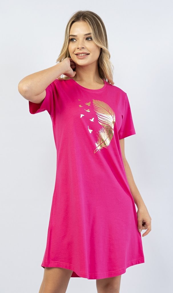Dámská noční košile s krátkým rukávem Peříčko. Dámská noční košile s krátkým rukávem má na přední straně natištěné veliké zlaté peříčko s letícímí ptáky v povzdálí. Jednobarevný podklad košile dává obrázku krásně vyniknout. Použitý materiál je jemný a poddajný na dotek. Košile je vhodná na denní nošení.
