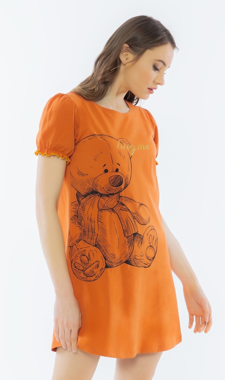 Dámská noční košile s krátkým rukávem Velký méďa. Roztomilá dámská noční košilka s nabíranými rukávy má na boku velký obrázek medvídka se zlatým nápisem Hug me. Košilka je kratší,použitý materiál je jemný a poddajný na dotek. Košile je vhodná i na denní nošení.