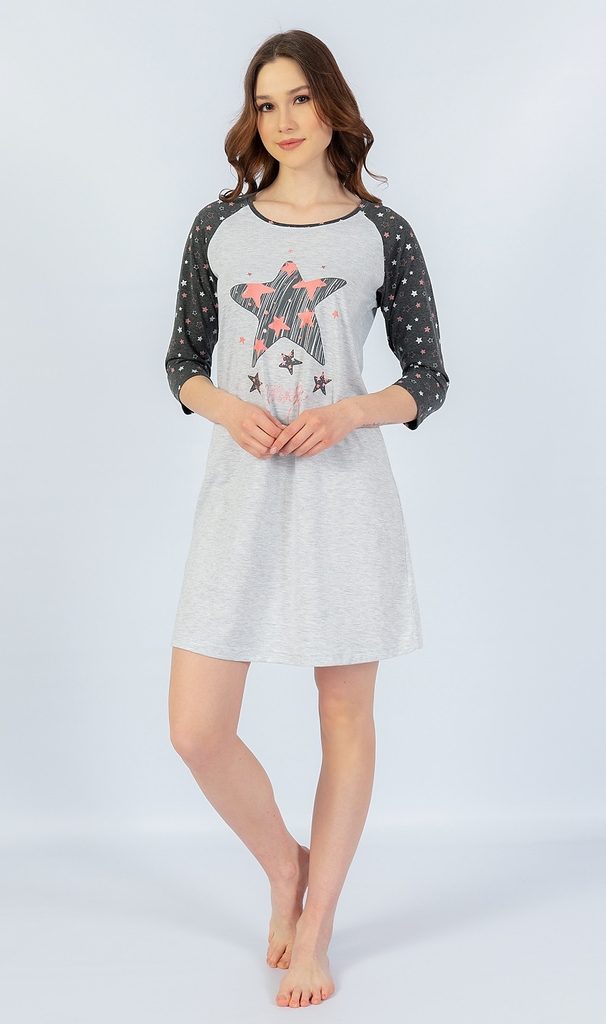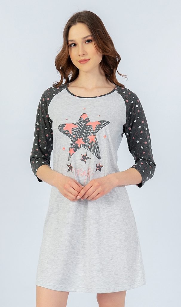 Noční košile s hravým motivem. Košilka má tříčtvrteční rukávy v tmavě šedé barvě, potištěné drobnými hvězdičkami. Zbytek košile je v jednotné světle šedé barvě a na hrudi má obrázek velké hvězdy s nápisem.