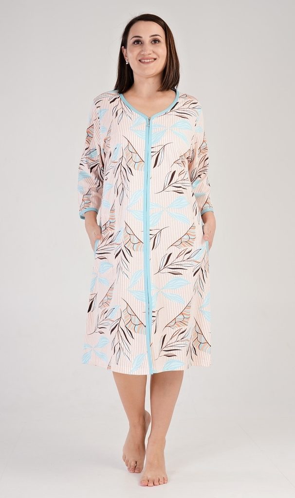 Dámské bavlněné domácí šaty s tříčtvrtečním rukávem Puntík. Noční košile má zapínání na zip a je ozdobená potiskem puntíčků. Na předním díle je našitá jedna kapsa ozdobená lemovkou. Bavlněný materiál je poddajný a jemný na dotek. Noční košile je vhodná i na denní nošení.