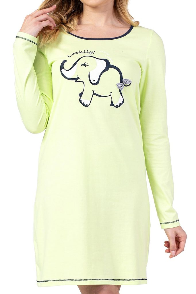 Dámská noční košilka 142 green REGINA - zelená barva - z vysoce jakostní bavlny - na přední straně zdobené potiskem - dlouhé rukávy - prošívané lemy