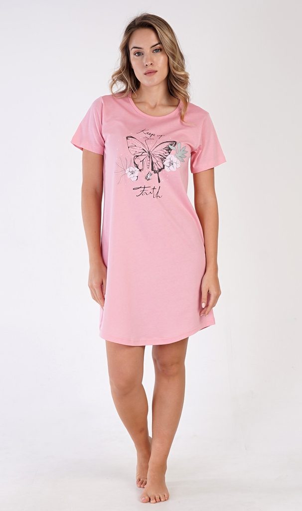 Dámská bavlněná noční košile s krátkým rukávem Butterfly. Dámská noční košile s kulatým výstřihem je jednobarevná, na hrudi má nápis 'Keep up your faith' a obrázek motýla. Použitý materiál s obsahem bavlny 100% je příjemný a poddajný na dotek.