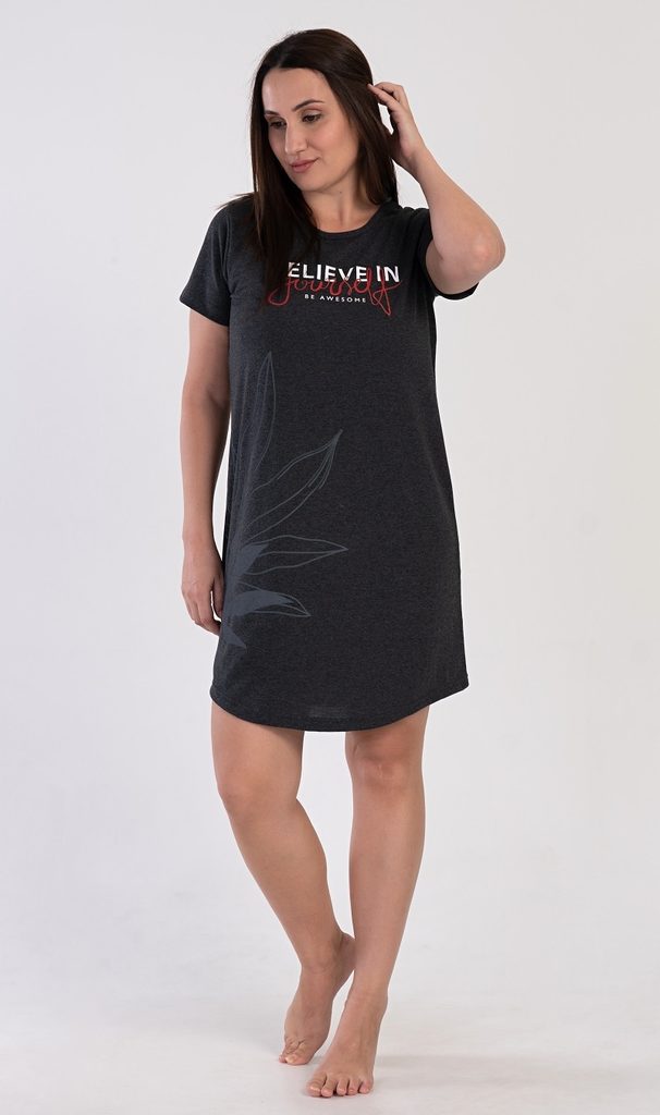 Dámská noční košile s krátkým rukávem Katka. Dámská noční košile s kulatým výstřihem je v antracitové barvě, na hrudi má nápis 'Believe in yourself be awesome' a na boku potisk listů. Použitý materiál s obsahem bavlny 50% je příjemný a poddajný na dotek.