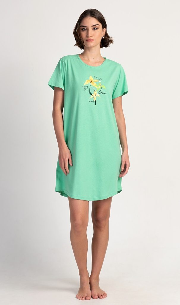 Dámská bavlněná noční košile s krátkým rukávem Paula. Noční košile s kulatým výstřihem a příjemnou délkou nad kolena má na hrudi obrázek exotických květů a drobné nápisy. Použitý materiál s obsahem bavlny 100% je příjemný a poddajný na dotek.