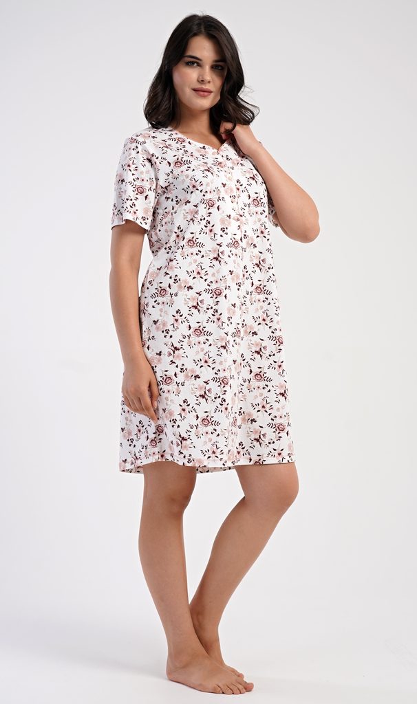 Dámská bavlněná noční košile s krátkým rukávem Růže. Dámská noční košile má příjemnou délkou po kolena a delší légu s pěti knoflíky. Košile s krátkým rukávem je potištěna růžemi v lososové barvě. Použitý materiál s podílem bavlny 100% je příjemný a poddajný na dotek.