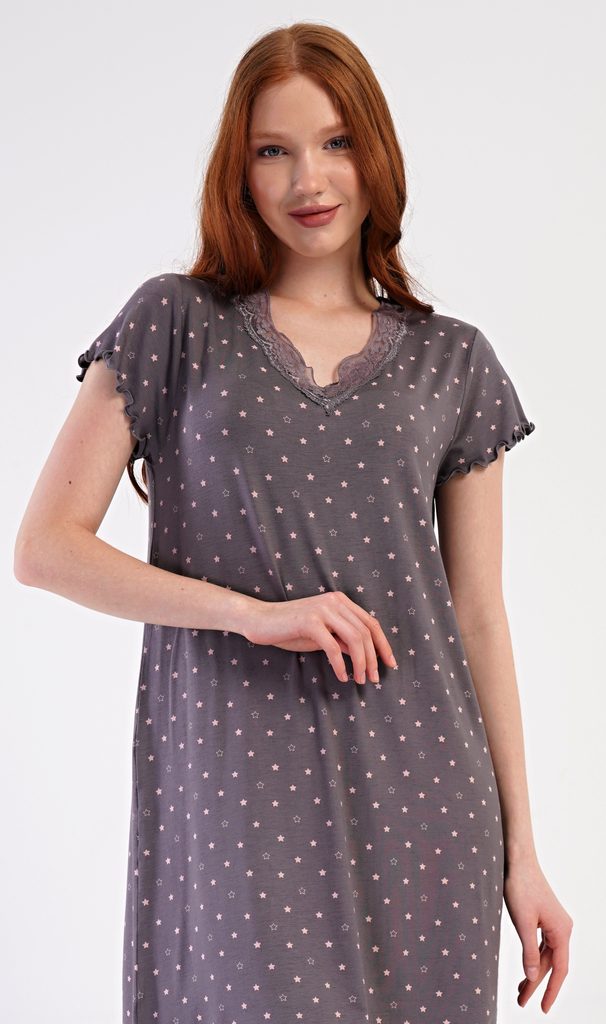 Dámská noční košile s krátkým rukávem Samanta. Noční košile má příjemnou délkou nad kolena a ozdobné žlábkování okolo rukávů a spodního lemu. Výstřih je ozvláštněn jemnou krajkou. Košile s krátkým rukávem je potištěna hvězdičkami. Použitý materiál ze směsi viskózy a lycry je příjemný a poddajný na dotek.