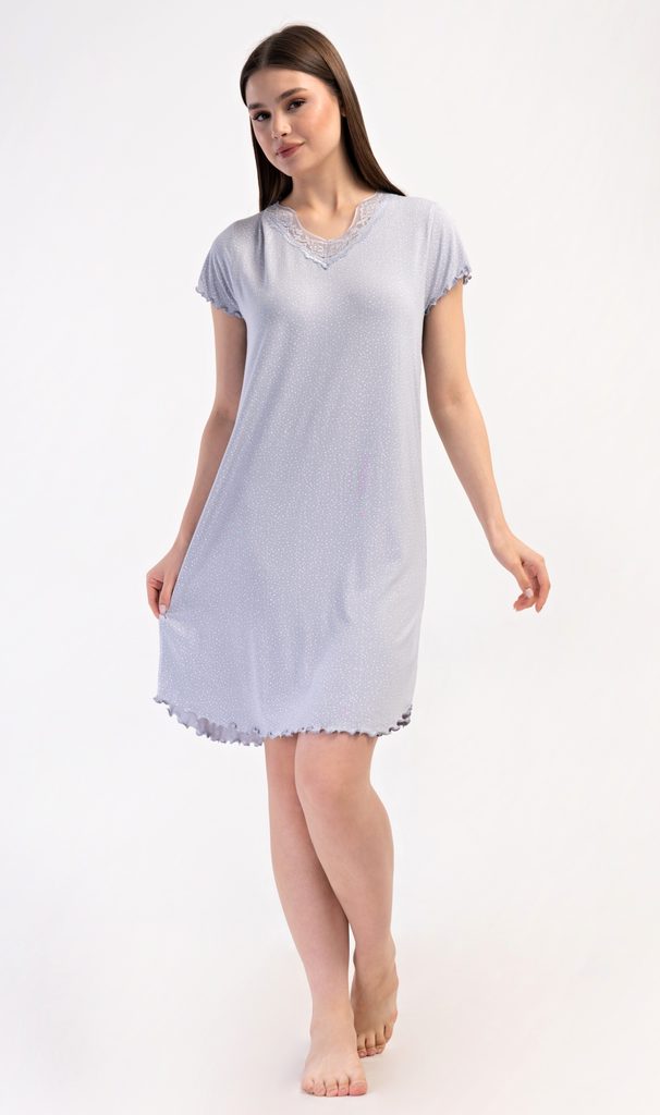 Dámská noční košile s krátkým rukávem Vločka. Noční košile s příjemnou délkou po kolena má žlábkování na rukávech a spodním lemu, výstřih je ozdoben krajkou. Na látce košile jsou natištěny drobné puntíky. Použitý viskózový materiál s příměsí lycry je příjemný a poddajný na dotek.