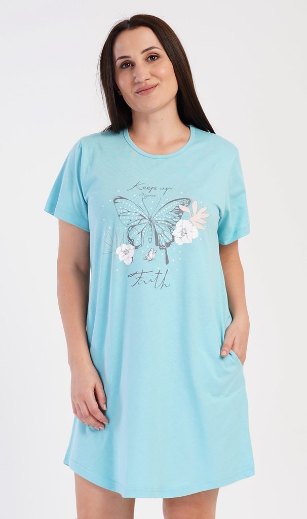 Dámské bavlněné domácí šaty s krátkým rukávem Motýl. Domácí šaty s kulatým výstřihem a kapsami mají na hrudi obrázek motýla a nápis 'Keep up your faith'. Použitý bavlněný materiál je příjemný a poddajný na dotek. Šaty jsou pohodlné, využijete je téměř při všech volnočasových aktivitách. Jsou vhodné na spaní i na denní nošení.