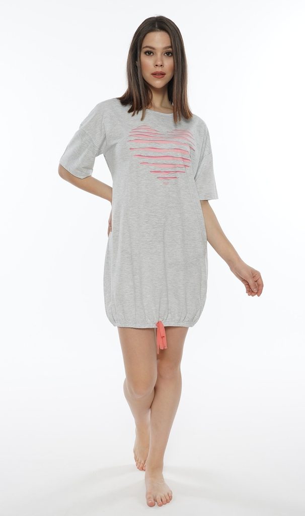 Dámské domácí šaty s krátkým rukávem Srdce. Pohodlné dámské šaty mikinového typu mají ve spodní části šňůrku ke stažen. Na přední části je obrázek srdce s efektem připomínajícím průstřihy. Šaty jsou díky svém střihu pohodlné, a jistě je využijete téměř při všech volnočasových aktivitách. Použitý materiál je jemný a poddajný na dotek. Šaty jsou vhodné na denní nošení.