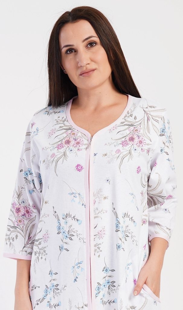 Dámské bavlněné domácí šaty s tříčtvrtečním rukávem Margot. Pohodlné rozepínací šaty v příjemné délce pod kolena využijete téměř při všech volnočasových aktivitách. Mají praktické kapsy a zapínání na zip. Jsou potištěny květy v jemných pastelových tónech, výstřih a rukávy zdobí olemování ve světle lososové barvě. Použitý bavlněný materiál je příjemný a poddajný na dotek.
