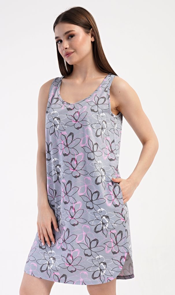 Dámská bavlněná noční košile na ramínka Mia. Noční košile se širšími ramínky a kulatým výstřihem má praktické kapsy, je potištěna květy. Použitý materiál s obsahem bavlny 100% je příjemný a poddajný na dotek. Košile je vhodná i na denní nošení, obvzlášť ji oceníte v horkých letních dnech.
