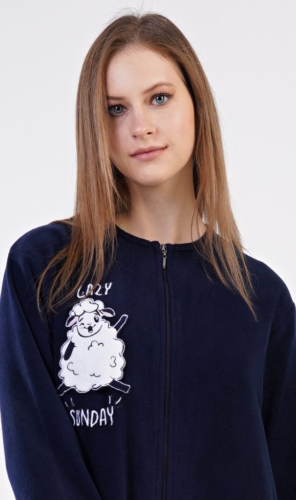 Dámský polarový overal Ovečka. Dámský overal na zip s našitou aplikací s motivem veselé ovečky. Na tmavě modrém podkladu je vyšitý nápis Lazy sunday. Použitý materiál je hřejivý a poddajný na dotek.
