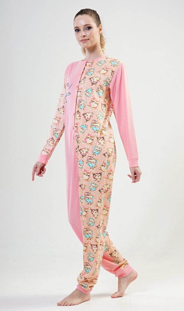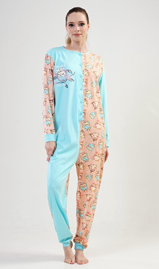 Dámský bavlněný overal Sovičky. Dámský celopropínací overal na knoflíky s motivem soviček. Použitý materiál je jemný a poddajný na dotek.