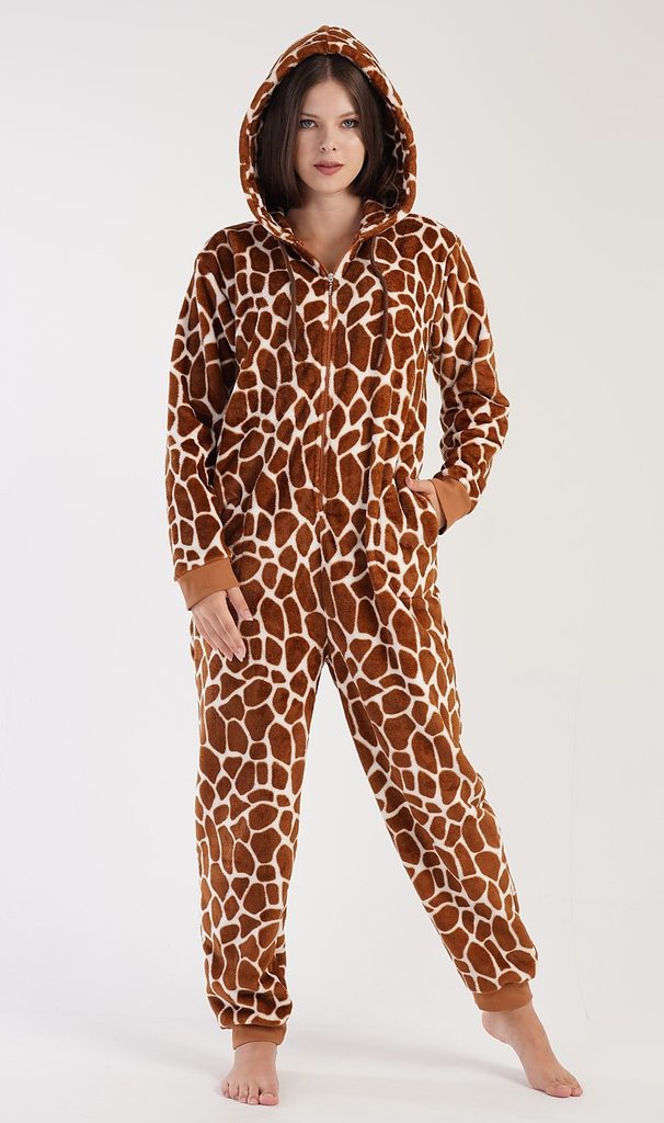 Dámský softový overal Žirafa. Overal má kapuci, zapínání na zip a praktické kapsy. Kalhoty a rukávy jsou zakončeny lemy. Zaujme výrazným žirafím vzorem. Použitý softový materiál je hřejivý a poddajný na dotek, je vhodný i jako domácí oblečení, obzvlášť ho oceníte v chladných zimních dnech.