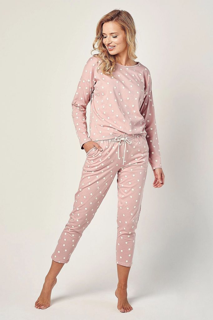 Dámské pyžamo 2979 Chloe TARO - vyrobené z vysoce kvalitní a měkké bavlny - tričko je růžové barvy s dlouhými rukávy - růžové kalhoty s kapsami - celý komplet je ozdobený bílými puntíky