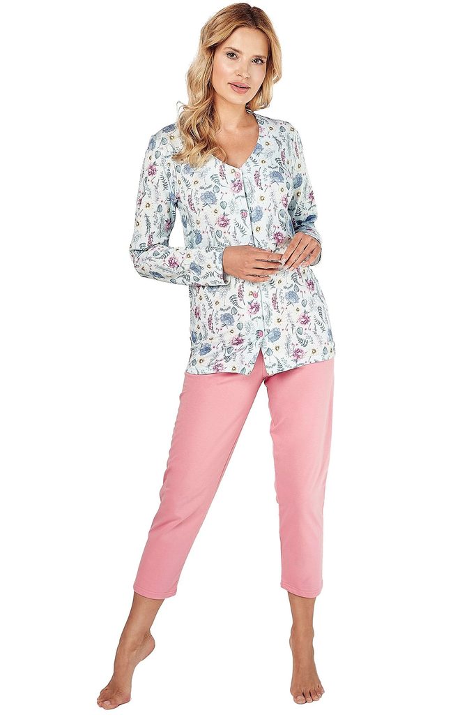 Dámské pyžamo 2991 Valencia TARO - vyrobené z vysoce kvalitní a měkké bavlny - tričko je bílé barvy s dlouhými rukávy - s květinovým motivem - zapínání na knoflíky - dlouhé kalhoty růžové barvy