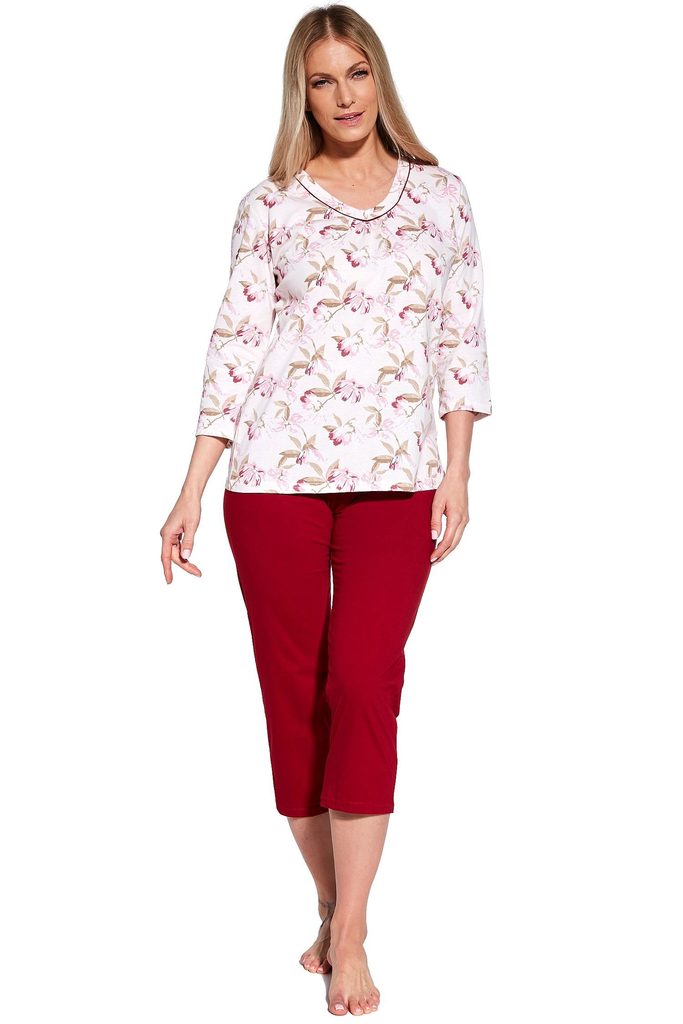 Dámské pyžamo 481/360 Adele CORNETTE - bavlněný materiál je poddajný a jemný na dotek - bílé tričko s tříčtvrtečními rukávy - s květinovým potiskem - jednobarevné capri kalhoty