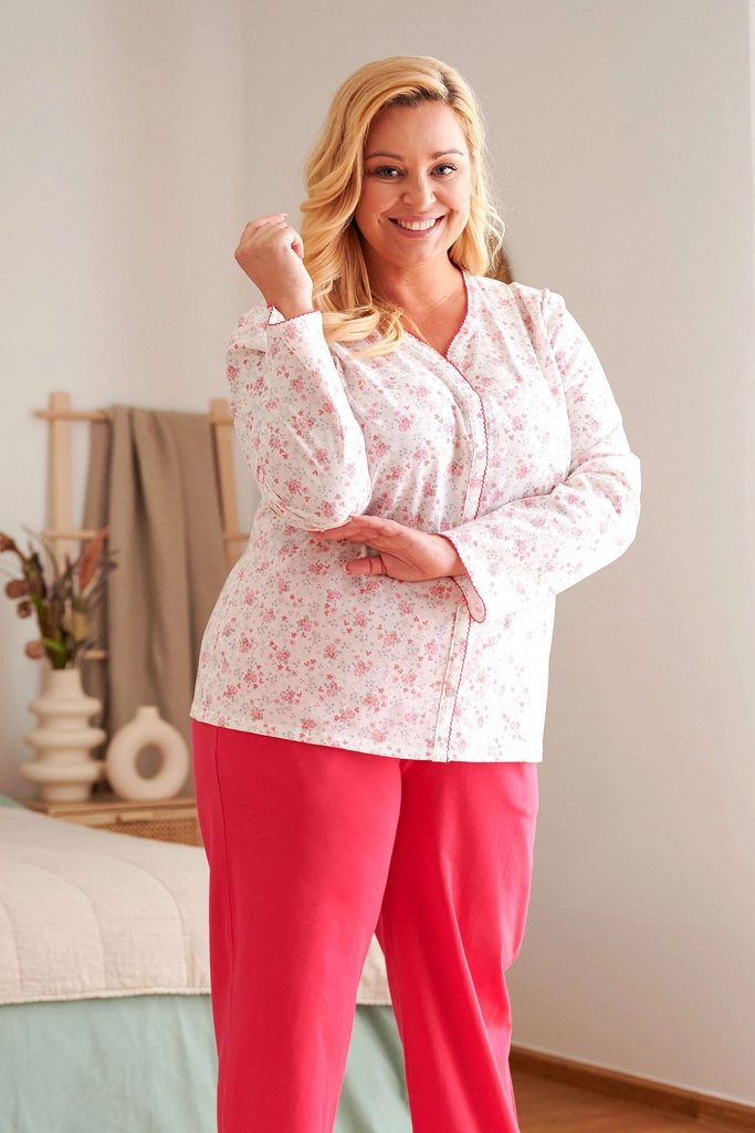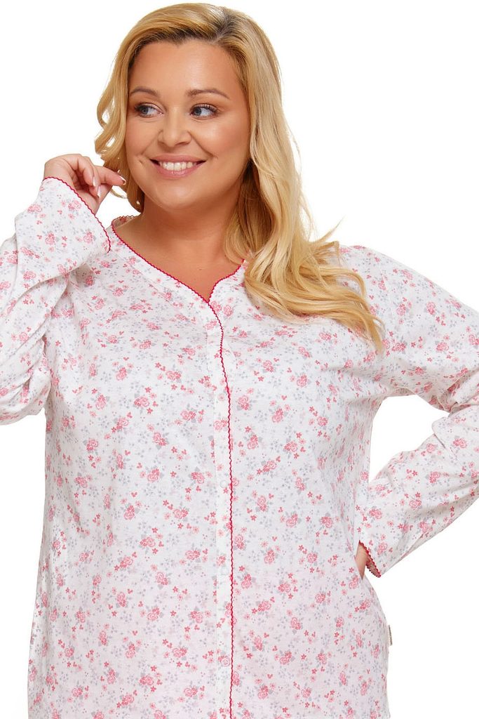 Dámské pyžamo 5282 Doctor Nap - vyrobené z velmi kvalitní a příjemné bavlny - bílá košile na zapínání a s dlouhými rukávy - s růžovým květinovým potiskem - dlouhé červené kalhoty - certifikát OEKO-TEX Standard 100