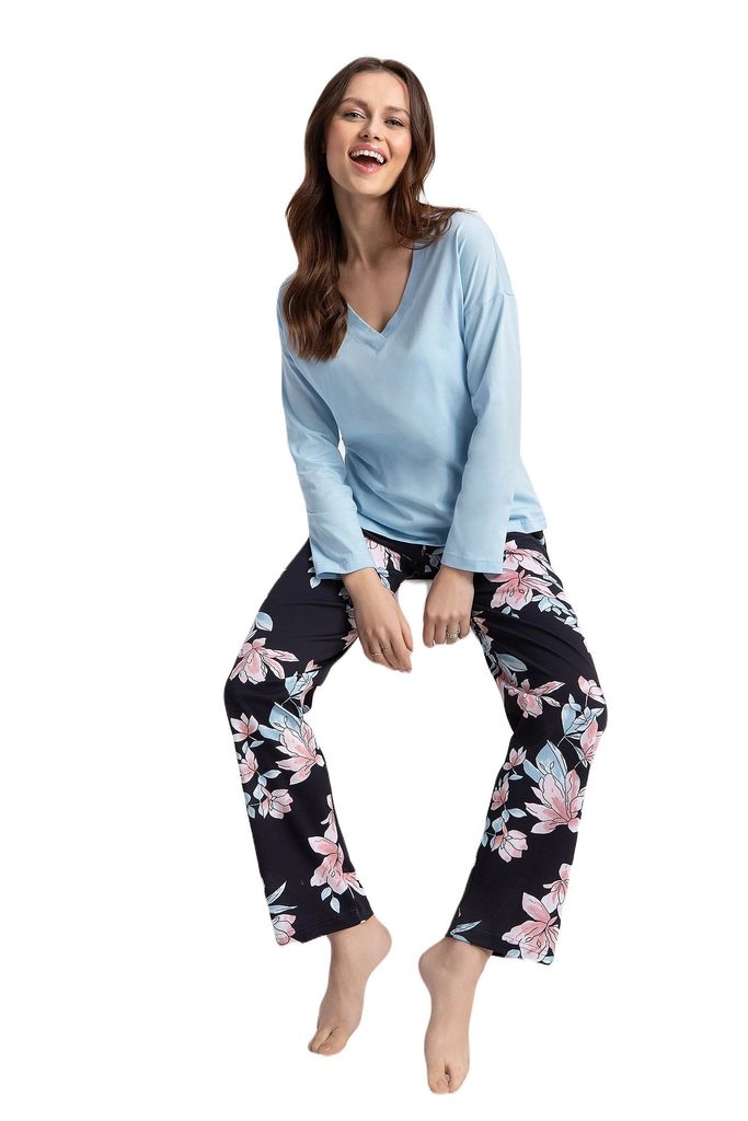 Dámské pyžamo 614 Luna - z vysoce jakostní bavlny - světle modré tričko s dlouhými rukávy - dlouhé vzorované kalhoty mají v pase gumu - s kapsami - pyžamo je vhodné i na denní nošení
