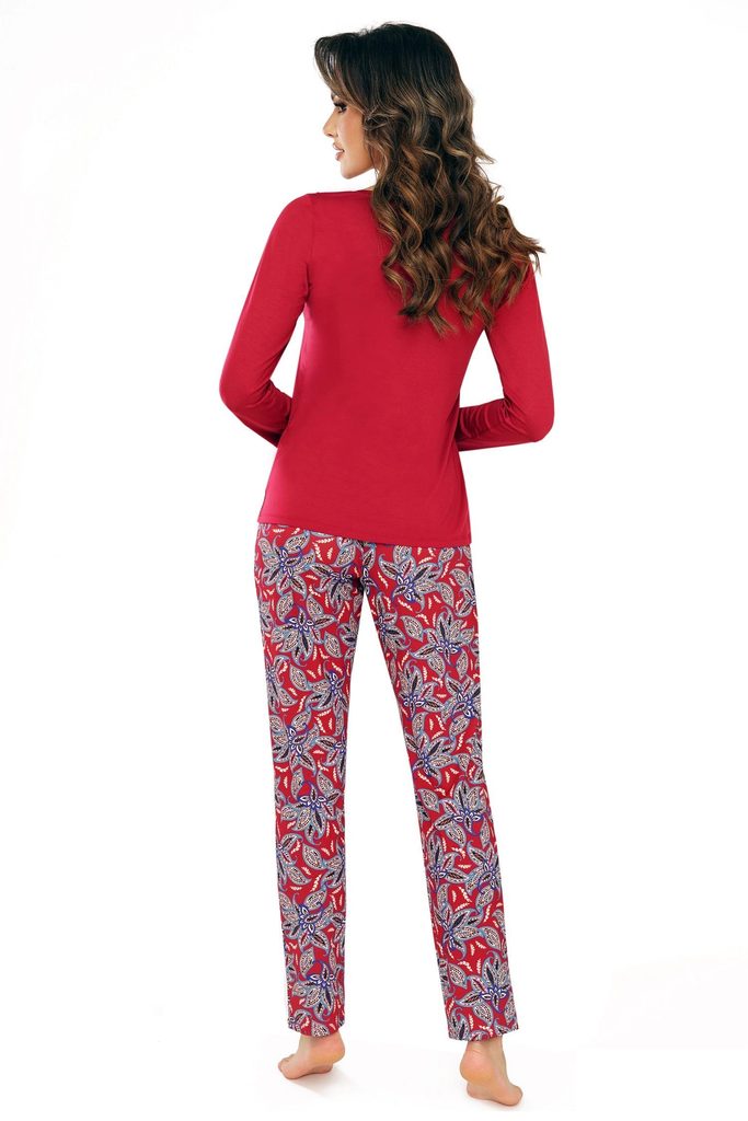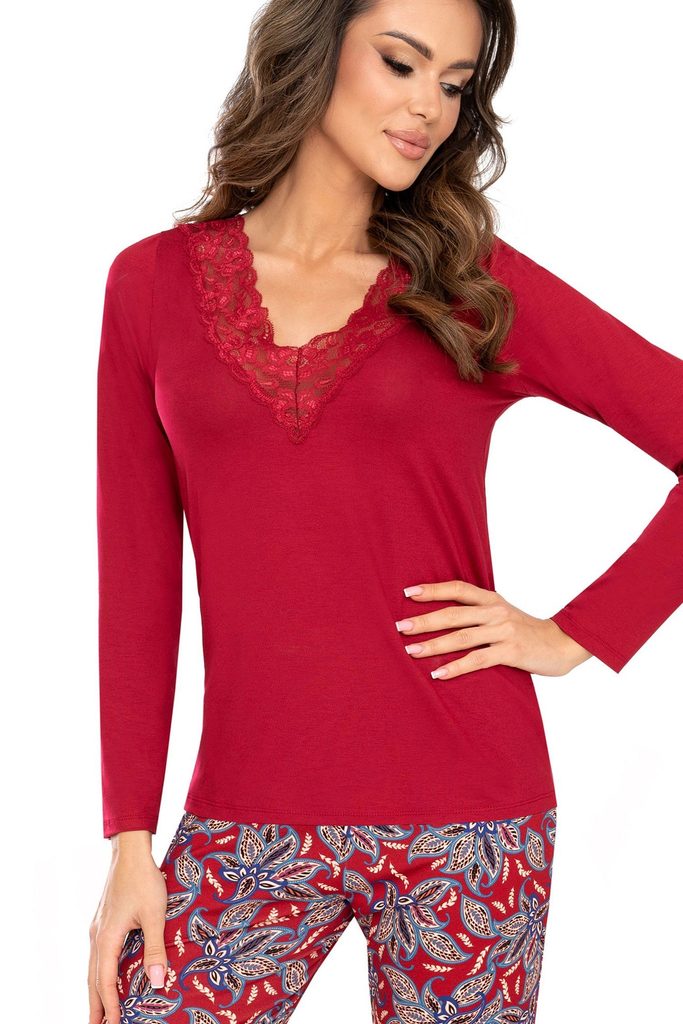 Dámské pyžamo Rita Donna - bordó barva - vyrobené z velmi kvalitní viskózy - dlouhé rukávy - výstřih zdobený efektní krajkou - dlouhé vzorované nohavice - široká guma v tunýlku ozdobená saténovou mašlí