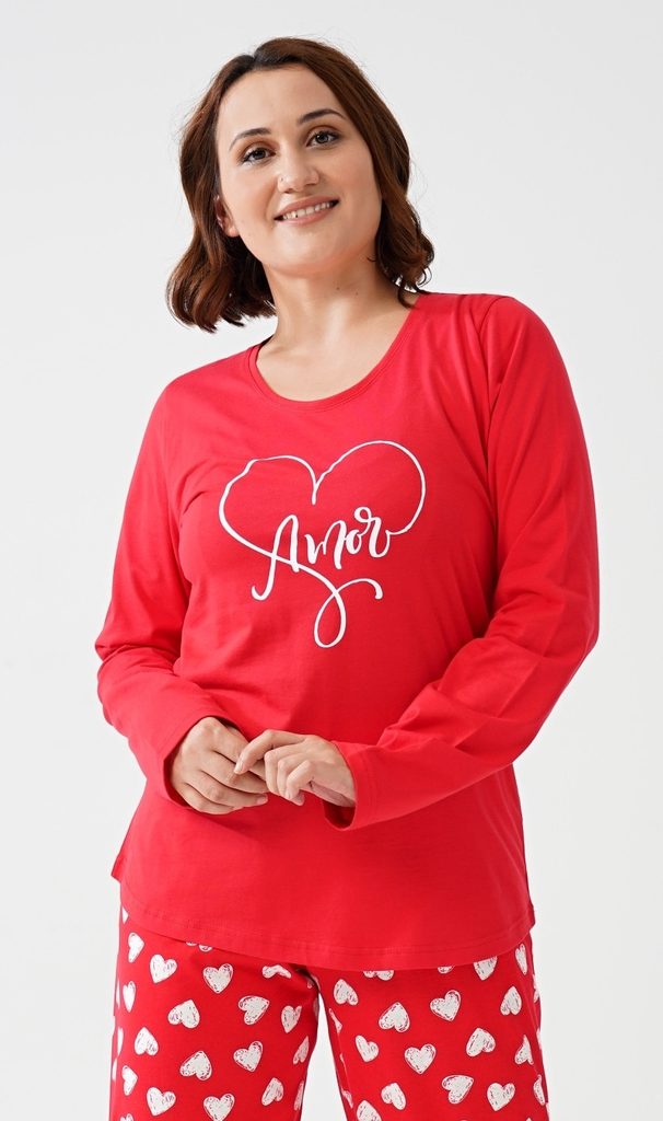 Dámské pyžamo dlouhé Amore mio. Dámské pyžamo se skládá z trička s dlouhým rukávem a dlouhých kalhot. Triko je jednobarevné - červené s potiskem bílých srdíček. Kalhoty jsou do gumy, na stažení šňůrkou , jednobarevné doplněné nápisem amore mio (my love). Použitý materiál je poddajný a příjemný na dotek.