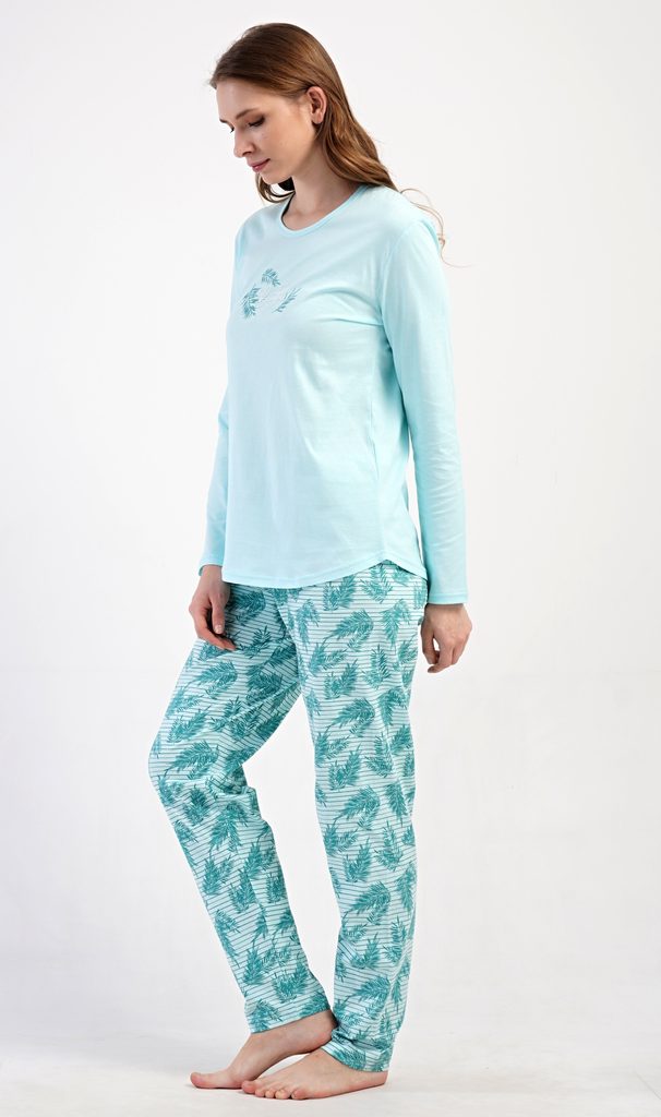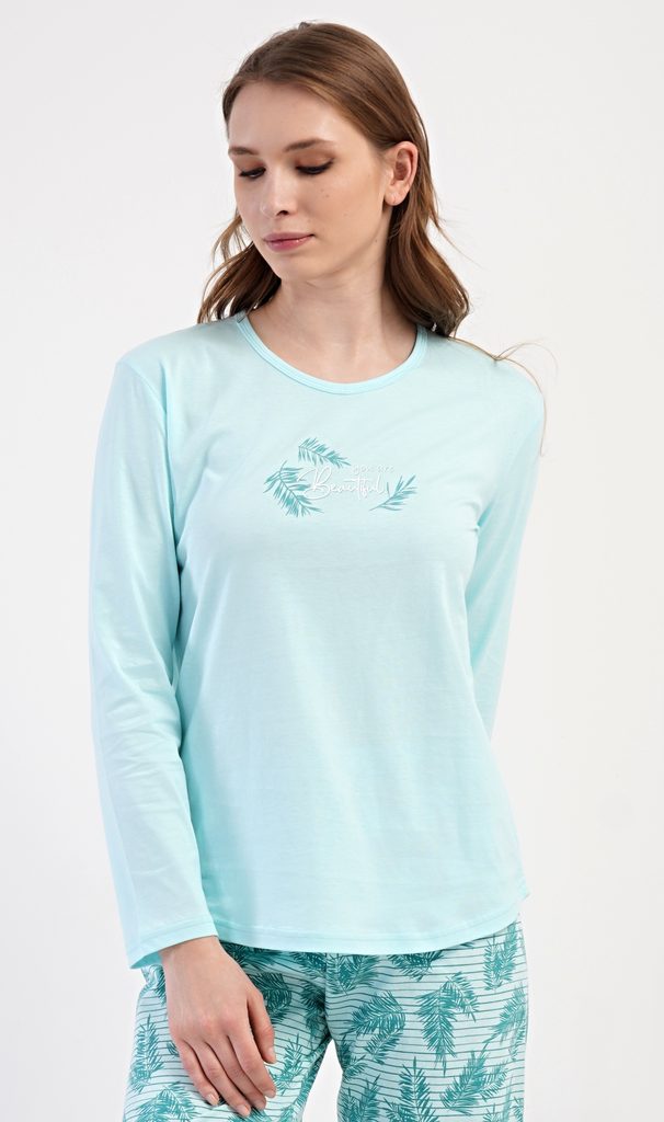 Dámské bavlněné dlouhé pyžamo Denisa. Dámské pyžamo se skládá z trika s dlouhým rukávem a dlouhých kalhot. Triko je jednobarevné, zdobené na hrudi drobným obrázkem větviček a nápis 'You are beautiful'. Motiv větviček se opakuje i na kalhotách, které mají v pase gumu a šňůrku na stažení, nemají kapsy. Použitý bavlněný materiál je poddajný a příjemný na dotek.