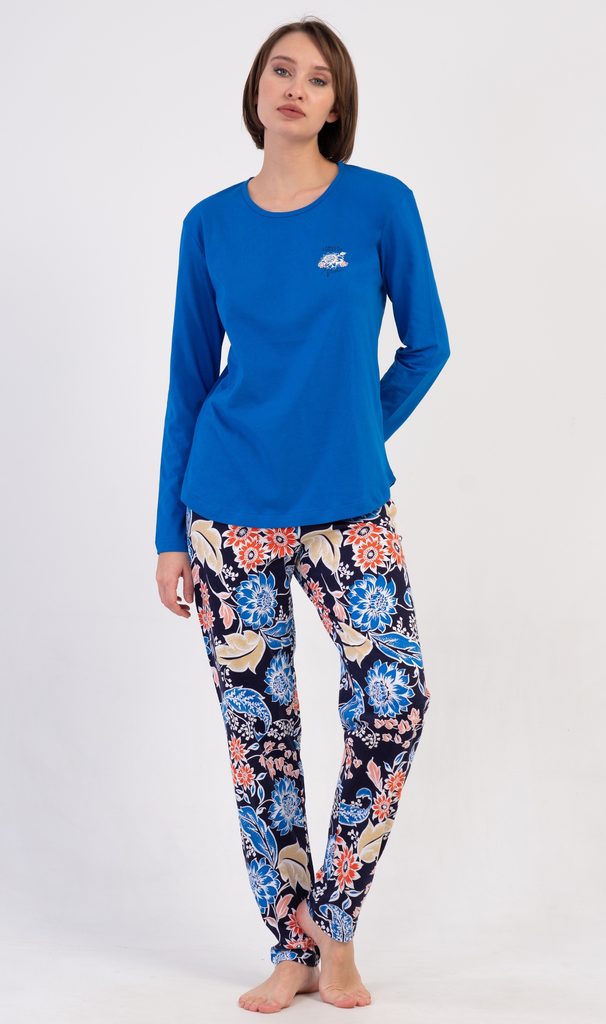 Dámské bavlněné dlouhé pyžamo Květy. Dámské pyžamo se skládá z trika s dlouhým rukávem a dlouhých kalhot. Triko je jednobarevné, zdobené obrázkem drobných květů. Květinový motiv se opakuje i na kalhotách, které mají v pase gumu a šňůrku na stažení, nemají kapsy. Použitý bavlněný materiál je poddajný a příjemný na dotek.
