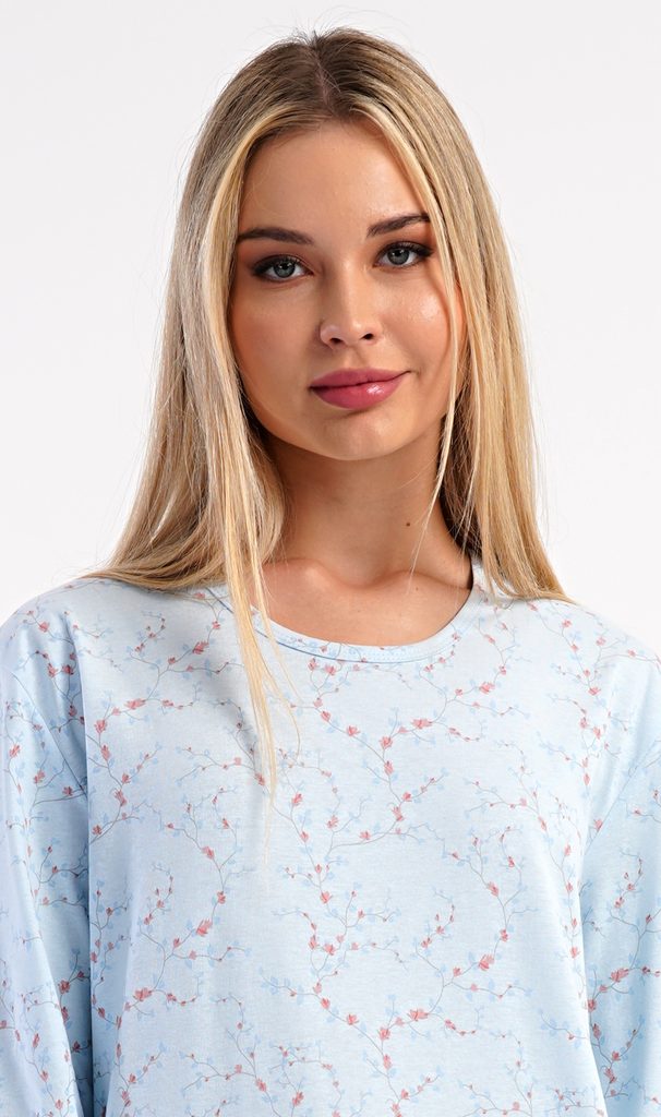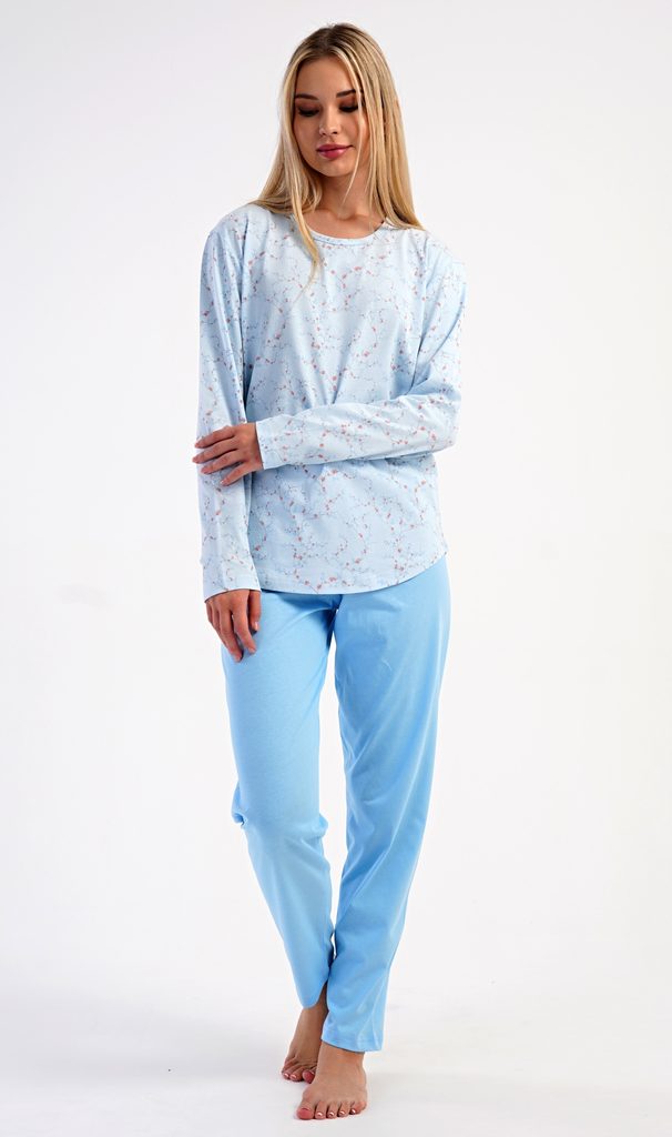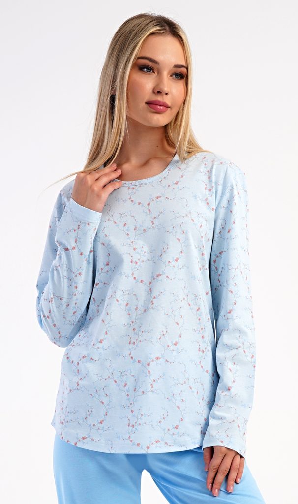 Dámské bavlněné dlouhé pyžamo Lauren. Dámské pyžamo se skládá z trika s dlouhým rukávem a dlouhých kalhot. Triko s kulatým výstřihem zdobí drobné květy. Jednobarevné kalhoty mají v pase gumu a šňůrku na stažení, nemají kapsy. Použitý bavlněný materiál je poddajný a příjemný na dotek.