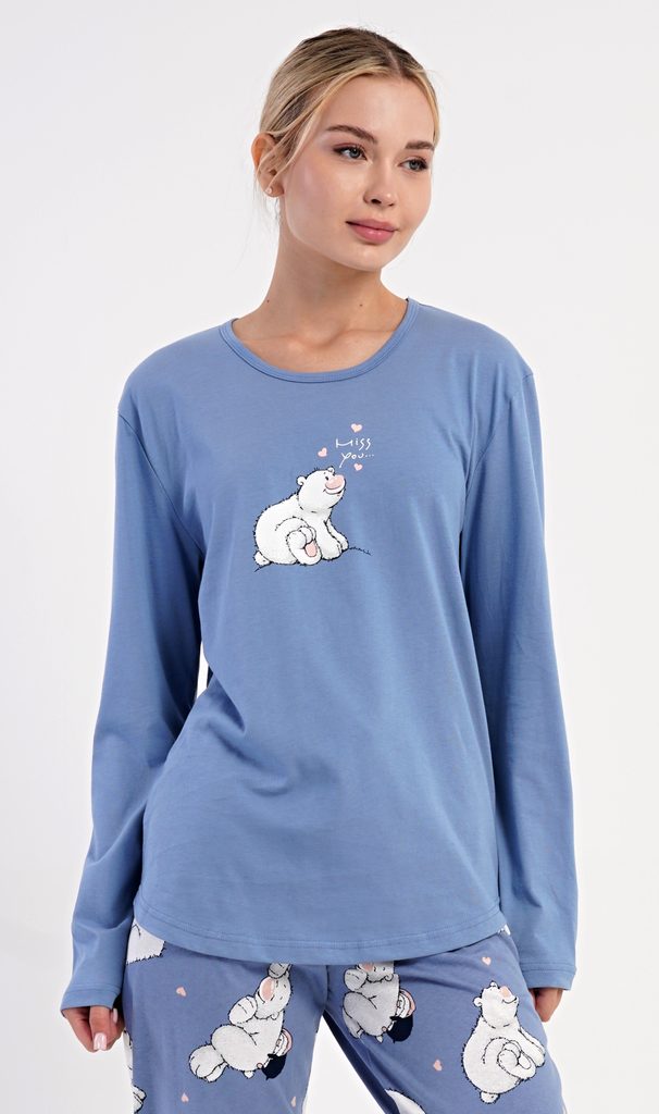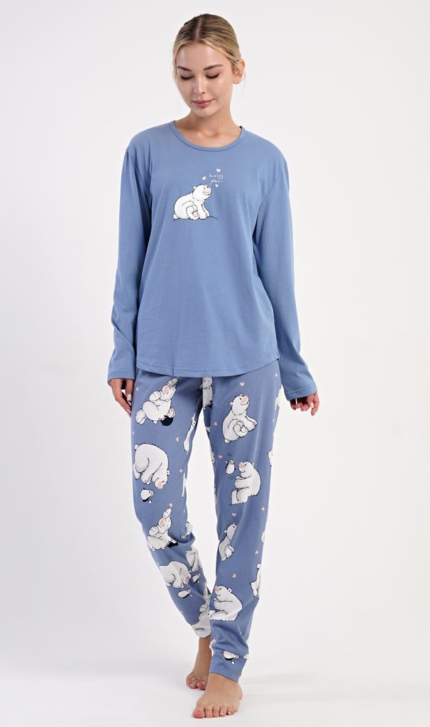 Dámské bavlněné dlouhé pyžamo Méďa a tučňák. Dámské pyžamo se skládá z trika s dlouhým rukávem a dlouhých kalhot. Triko s kulatým výstřihem je na hrudi zdobeno obrázkem ledního medvěda. Tento motiv se opakuje i na kalhotách, které mají v pase gumu a šňůrku na stažení, nemají kapsy. Použitý bavlněný materiál je poddajný a příjemný na dotek.