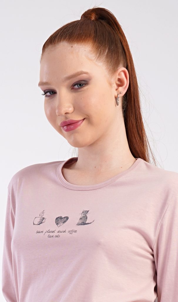 Dámské bavlněné dlouhé pyžamo Morning. Dámské pyžamo se skládá z trika s dlouhým rukávem a dlouhých kalhot. Triko je jednobarevné, zdobené obrázkem kotěte a drobným nápisem. Kalhoty mají v pase gumu a šňůrku na stažení, nemají kapsy. Použitý bavlněný materiál je poddajný a příjemný na dotek.