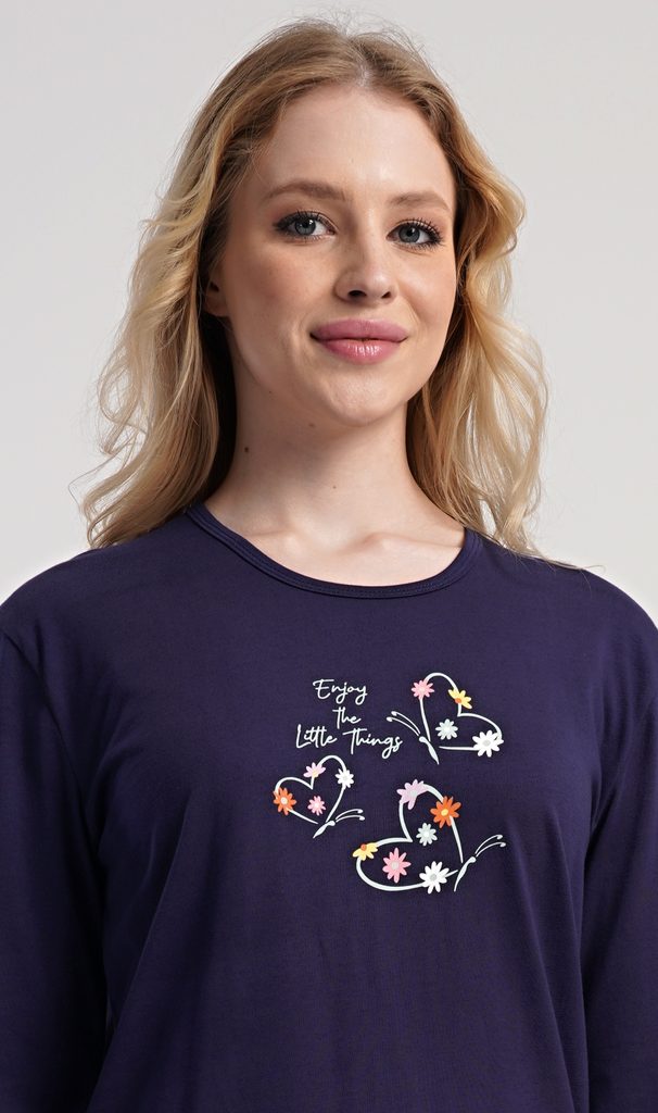 Dámské bavlněné dlouhé pyžamo Sarah. Dámské pyžamo se skládá z trika s dlouhým rukávem a dlouhých kalhot. Jednobarevné triko je ozdobeno obrázkem květů a motýlů. Květinový motiv se opakuje i na kalhotách, které mají v pase gumu a šňůrku na stažení, nemají kapsy. Použitý bavlněný materiál je poddajný a příjemný na dotek.