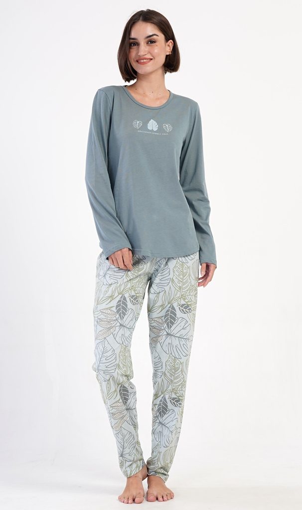 Dámské bavlněné dlouhé pyžamo Sofie. Dámské pyžamo se skládá z trika s dlouhým rukávem a dlouhých kalhot. Triko je jednobarevné, zdobené obrázkem listů a drobným nápisem. Motiv listů se opakuje i na kalhotách, které mají v pase gumu a šňůrku na stažení, nemají kapsy. Použitý bavlněný materiál je poddajný a příjemný na dotek.