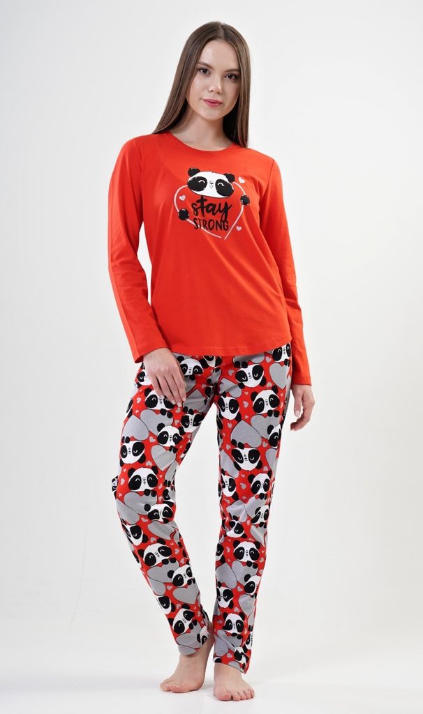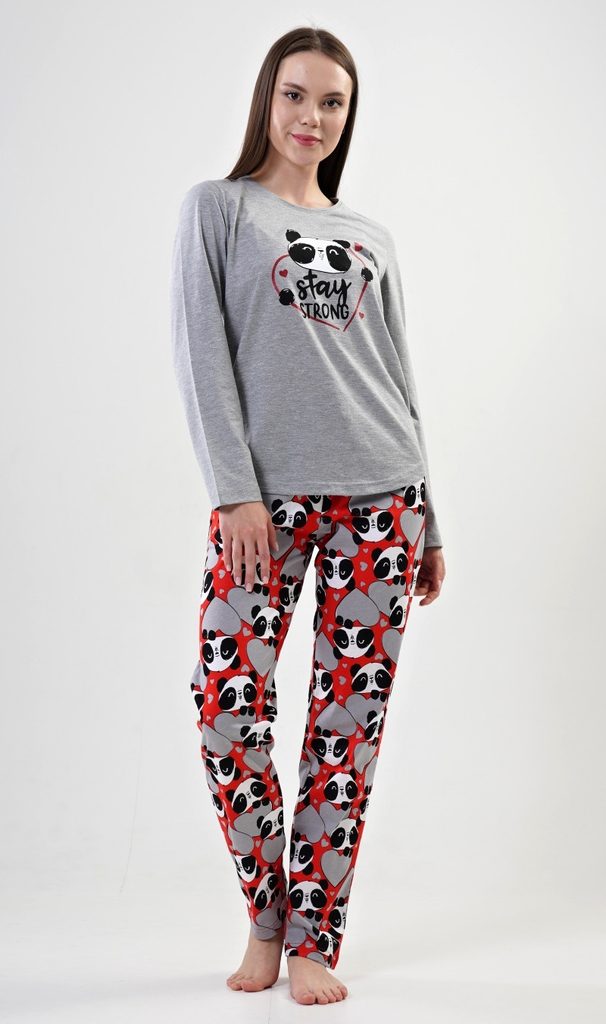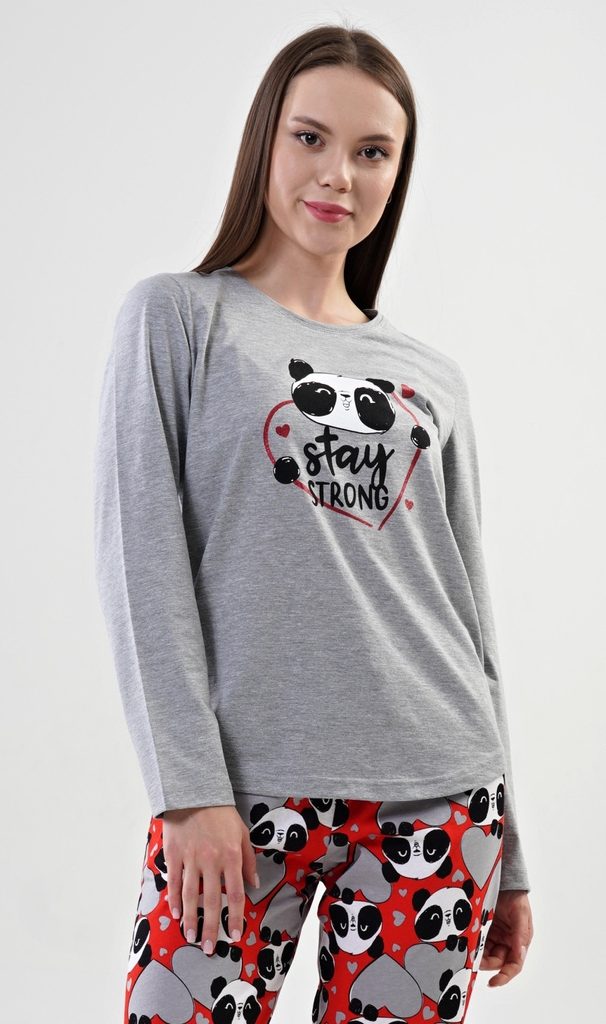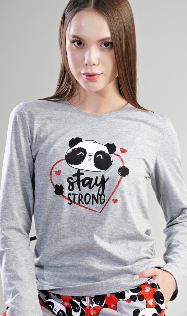 Dámské bavlněné pyžamo dlouhé Stay strong. Dámské pyžamo se skládá z trička s dlouhým rukávem a dlouhých kalhot. Triko je jednobarevné, zdobené nápisem Stay strong a obrázkem pandy. Kalhoty jsou červené, potištěné pandami a sdíčky. Kalhoty jsou do gumy, na stažení šňůrkou a mají kapsy. Použitý materiál je poddajný a jemný na dotek.