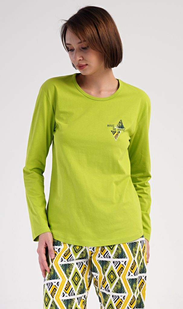 Dámské bavlněné dlouhé pyžamo Zuzana. Dámské pyžamo se skládá z trika s dlouhým rukávem a dlouhých kalhot. Triko je jednobarevné, zdobené malým obrázkem a nápisem 'Make me smile'. Kalhoty s geometrickým vzorem mají v pase gumu a šňůrku na stažení, nemají kapsy. Použitý bavlněný materiál je poddajný a příjemný na dotek.