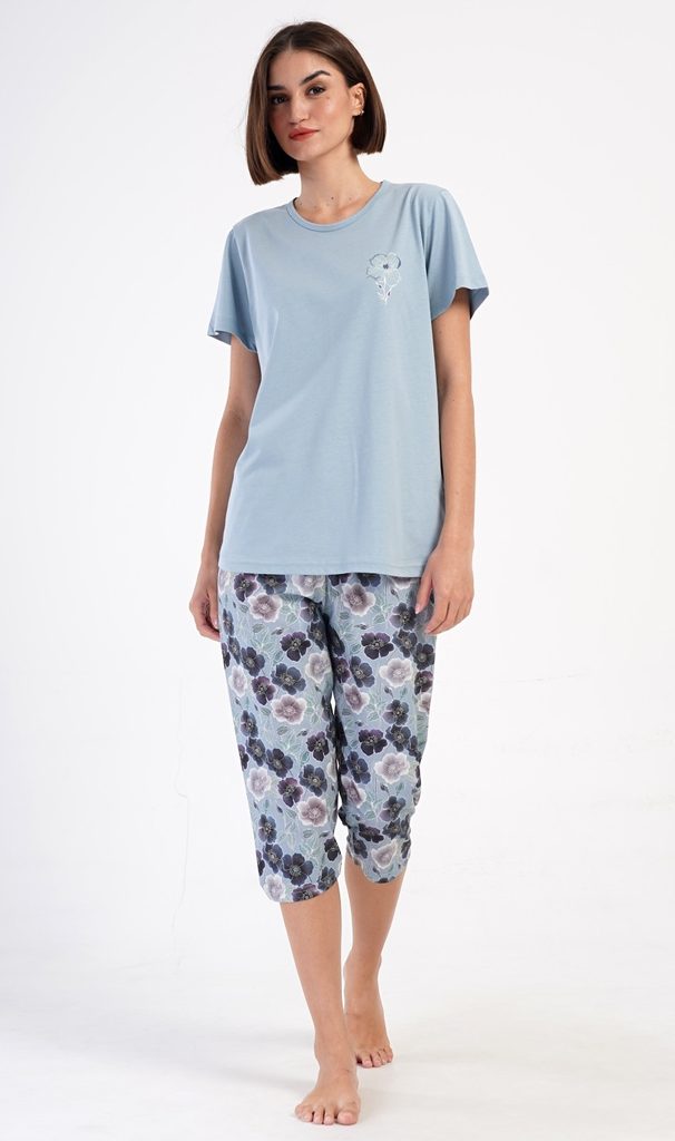 Dámské bavlněné kapri pyžamo Agnes. Dámské pyžamo se skládá z trička s krátkým rukávem a tříčtvrtečních kalhot. Tričko s kulatým výstřihem má na hrudi obrázek květu. Tento motiv se opakuje i na kalhotách, které mají v pase gumu a šňůrku na stažení, jsou bez kapes. Použitý bavlněný materiál je příjemný a poddajný na dotek.