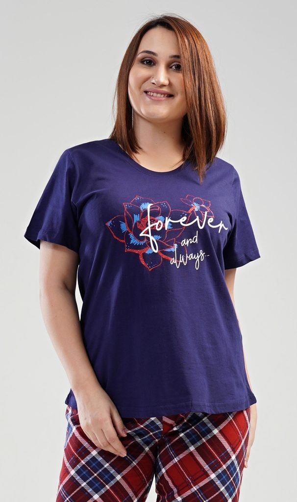 Dámské pyžamo kapri Forever. Dámské pyžamo se skládá z trička s krátkým rukávem a tříčtvrtečních kalhot. Na tričku je obrázek veliké květiny a nápis Forever and always. Tričko doplňují kostkované kalhoty. Použitý materiál je jemný a poddajný na dotek. Pyžamo je vhodné na denní nošení.