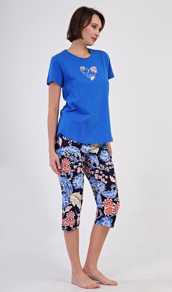 Dámské bavlněné kapri pyžamo Květy. Dámské pyžamo se skládá z trička s krátkým rukávem a tříčtvrtečních kalhot. Tričko s kulatým výstřihem zdobí obrázek květů ve tvaru srdce. Květinový vzor se opakuje i na kalhotách, které mají v pase gumu a šňůrku na stažení, jsou bez kapes. Použitý bavlněný materiál je příjemný a poddajný na dotek.