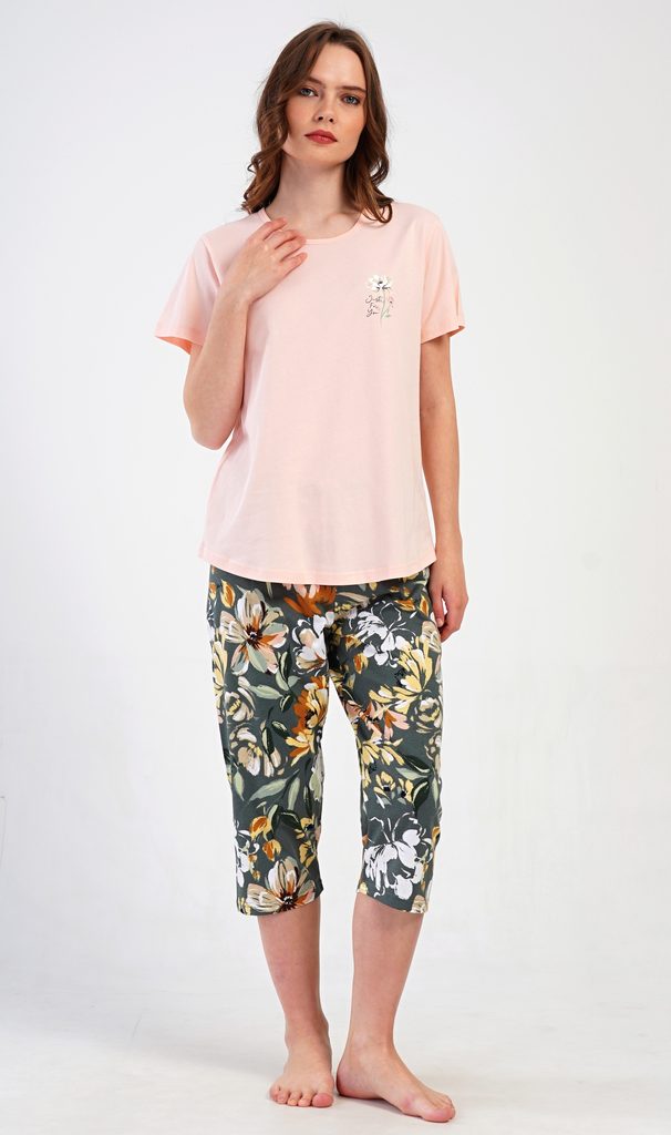 Dámské bavlněné kapri pyžamo Marie. Dámské pyžamo se skládá z trička s krátkým rukávem a tříčtvrtečních kalhot. Tričko s kulatým výstřihem má na hrudi obrázek květu. Tento motiv se opakuje i na kalhotách, které mají v pase gumu a šňůrku na stažení, jsou bez kapes. Použitý bavlněný materiál je příjemný a poddajný na dotek.
