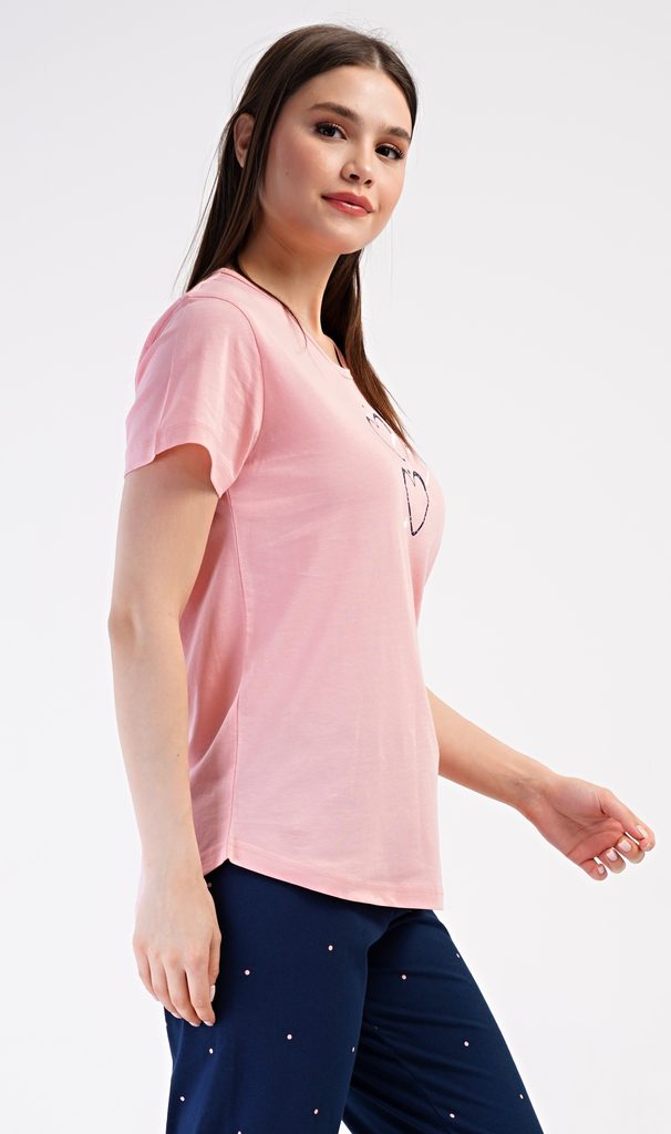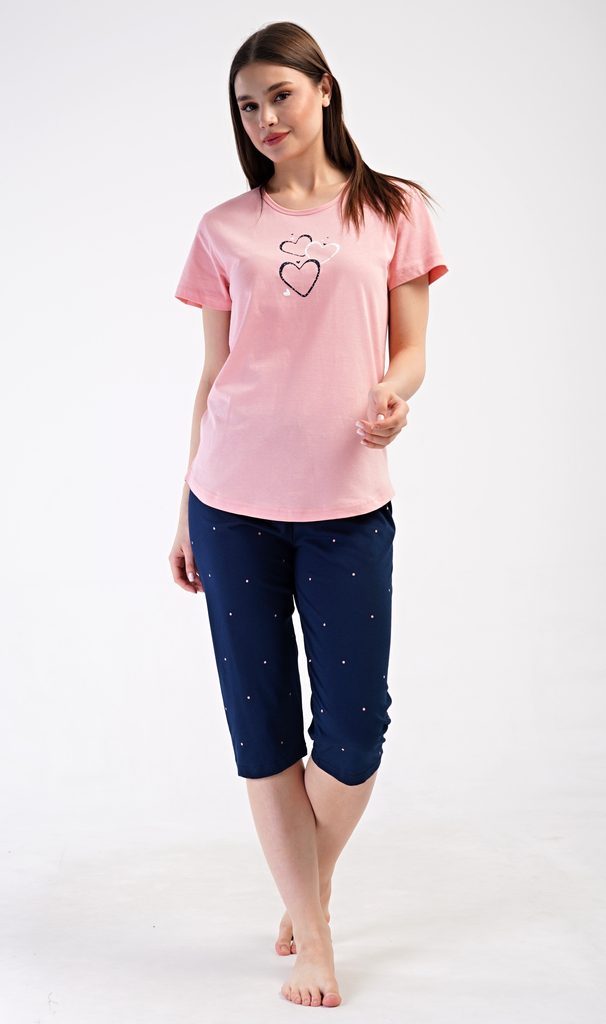 Dámské bavlněné kapri pyžamo Srdce. Dámské pyžamo se skládá z trička s krátkým rukávem a tříčtvrtečních kalhot. Tričko s kulatým výstřihem zdobí na hrudi obrázek srdíček. Kalhoty potištěné drobnými puntíky mají v pase gumu a šňůrku na stažení, jsou bez kapes. Použitý bavlněný materiál je příjemný a poddajný na dotek.