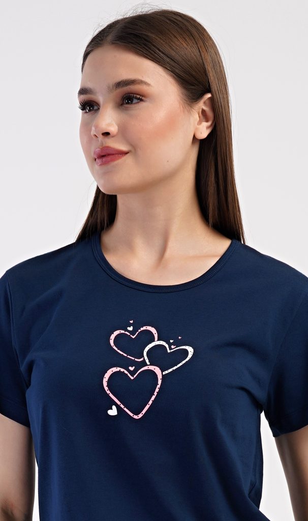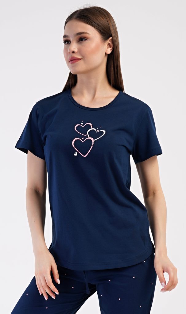 Dámské bavlněné kapri pyžamo Srdce. Dámské pyžamo se skládá z trička s krátkým rukávem a tříčtvrtečních kalhot. Tričko s kulatým výstřihem zdobí na hrudi obrázek srdíček. Kalhoty potištěné drobnými puntíky mají v pase gumu a šňůrku na stažení, jsou bez kapes. Použitý bavlněný materiál je příjemný a poddajný na dotek.