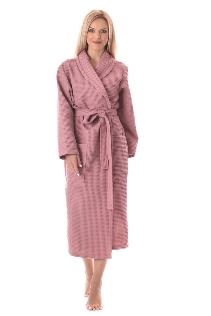Vaflový župan v krásné starorůžové barvě se šálovým límcem. Je vyroben z kvalitní vaflové bavlny, která umocňuje pocit komfortu a má vynikající funkční vlastnosti, a tak je tento župan ideálním doplňkem pro vaše volné chvíle ať už doma, v sauně a wellness nebo na cestách. Župan má dvě větší kapsy a pásek na zavazování.