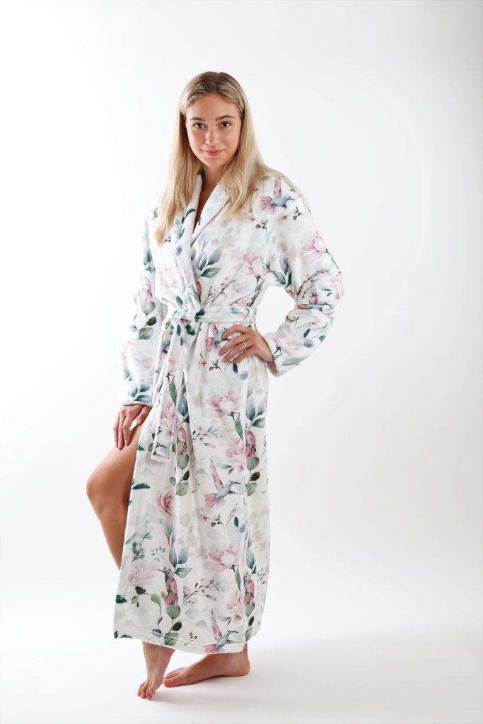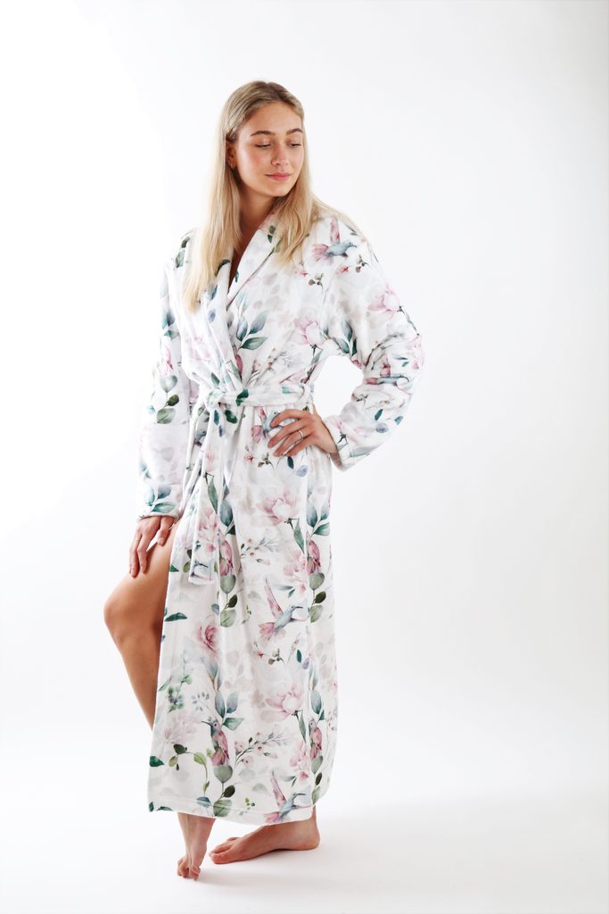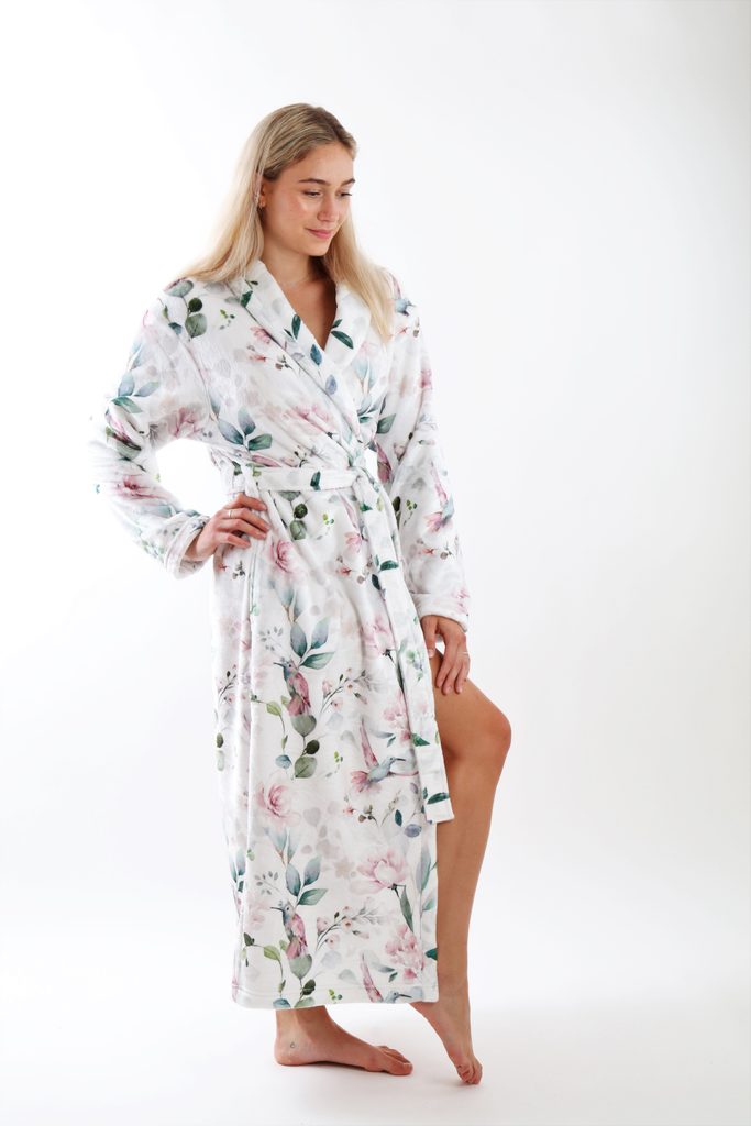 Župan Calypte - Zážitek z rozkvetlé zahrady. Ponořte se do atmosféry květin a šepotu ptačích křídel s tímto lehkým a příjemně hřejivým dámským županem. Pohodlný střih se šálovým límcem, kapsami a páskem na převázání ho činí ideálním společníkem pro chvíle odpočinku.