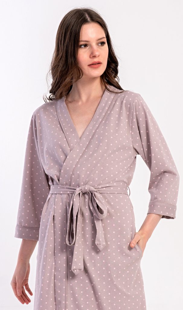 Dámský krátký bavlněný župan Adélka. Dámský župánek s tříčtvrtečním rukávem a délkou pod kolena je potišten drobnými puntíky. Župan má pásek ke stažení a praktické kapsy. Použitý bavlněný materiál je příjemný a poddajný na dotek, saje a oceníte ho i po koupeli.