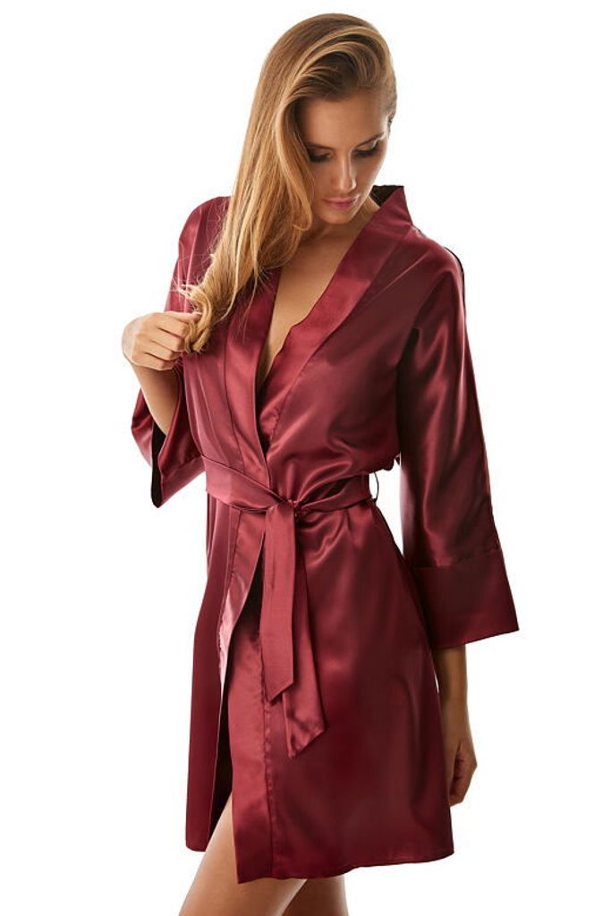 Dámský župan je vyrobený z jemného saténu. Kimonové rukávy můžete nosit jednoduše volně nebo jako zahnuté manžety. V páse je saténový pásek na zavazování.